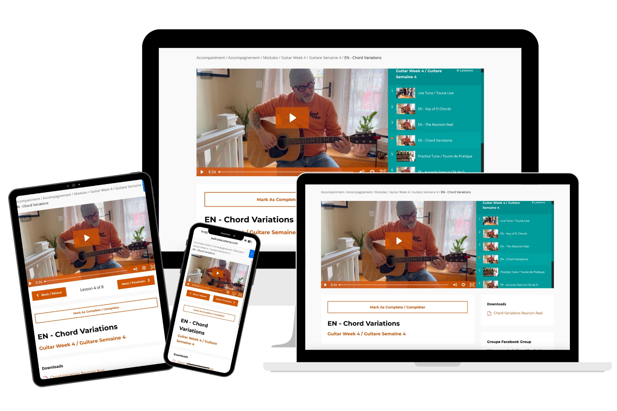 - Leçons hebdomadaires bilingues (français & anglais) : Une nouvelle leçon de guitare et une nouvelle leçon de piano chaque semaine.